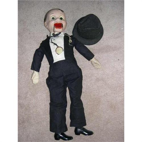 This is a 27" doll that is a take off on the Effanbee Edgar Bergen's Charlie McCarthy doll. I see no marks on him. It has composition head, hands and feet, cloth body, painted hair and googly disk eyes. The strings are at the back of the head to operate the mouth.