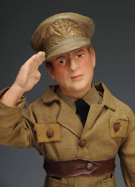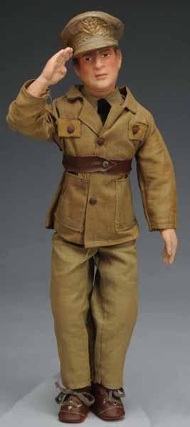 Description American, 1942. Made by Freundlich Novelty Corp. Portrait face with molded army cap (light wear). All composition doll with jointed shoulders and hips, arm raises to salute. All original uniform, shoes and socks. Condition (Excellent). Size 19" T.