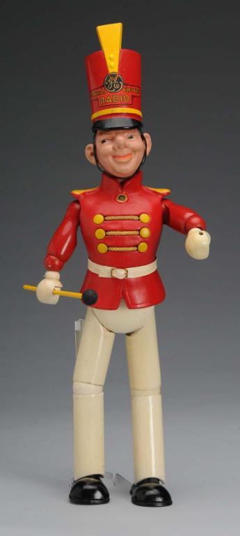 Jointed head, arms and legs carrying original baton, belt and original headpiece. Has "General Electric Radio GE" decal on top of hat. Also says "GE" on front of chest. Some crazing throughout head. Condition (Excellent). Size 20" T.