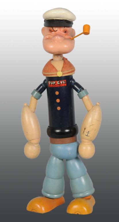 American. Appears to be all original including pipe. Has Popeye decal on chest marked "Copyright 1935 King Features Syndicate Inc." Some fading on felt neckpiece, wear to arms and face is dirty but could be cleaned easily. Possibly restrung. Condition (Excellent). Size 14" T.