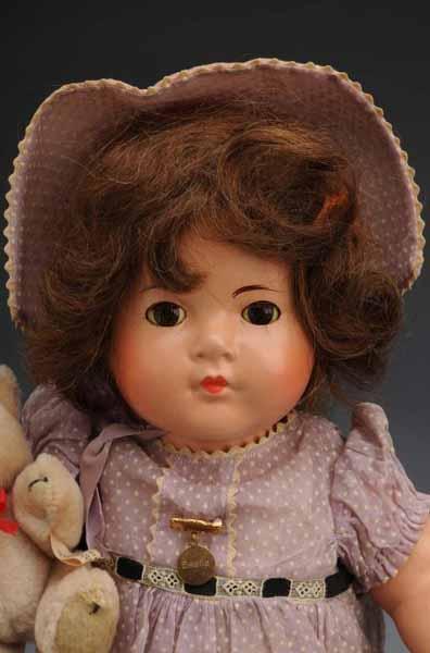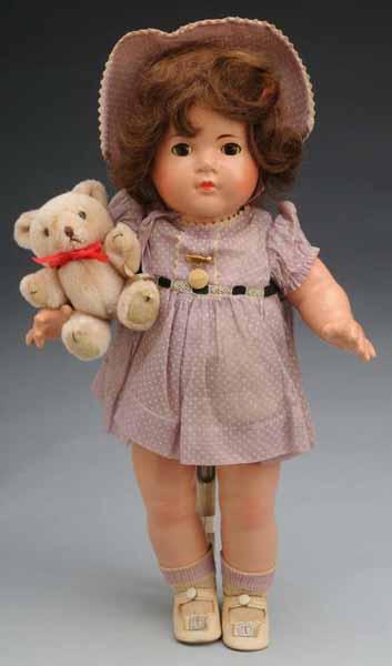 Description American, 1935. Marked "Dionne Alexander" on head and Alexander on body. Sleeping eyes with upper eyelashes (oiled), closed mouth, rosy cheeks, original human hair wig. All composition toddler body. All original in tagged Alexander dress, bonnet, undies, shoes an socks, Emelie name pin, too. Light overall crazing. Condition (Excellent). Size 16" T.