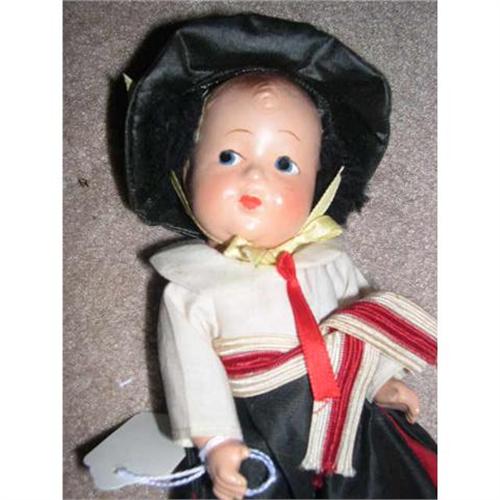 This is a great find. This composition doll made by Mollye is in it's box. When do you find a composition doll in the box? Not often. The box label says Molly'es International Costumed Doll 2716 Maraquita Spanish. The doll is jointed at the head, arms, and legs. He has only some very light crazing. He has great facial paint. There is black yarn that goes from one side of his head to the other which is to be his black hair. He has brown painted hair under his hat but I guess they figured when the hat was on you wouldn't see it. That tells me this mold was used for other characters. The hat is a made of black oilcloth I believe and tied on with a yellow ribbon. I did not want to untie it as I don't believe it has ever been untied. The outfit is adorable. It has a button in the back. The pants have a pleat of red material. He has on little white oilcloth tie shoes.He is from a smoke free environment. Buyer to pay $20 for shipping, insurance, and handling. If you can love them, please bid. Thanks for viewing. He reminds me of the Ginny composition Toddles doll. Thanks.