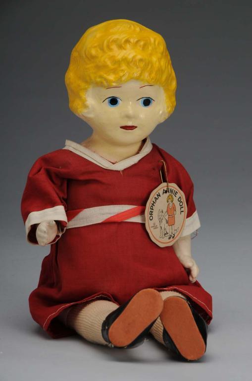Cloth-covered body with original clothing marked "Famous Artist Syndicate" on back of neck. Original Orphan Annie Harold Gray tag shows Orphan Annie and Sandy. Some inpainting on front of face and hair. Condition (Very Good - Excellent). Size 14" T.