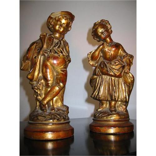 These 11 inch tall Magnificent European Sculptures of boy and a girl in victorian outfit in goldtone-red color are gorgeous. They are from composition and wood and are in very good vintage condition. a chip on the boy's hat. These sculptures are highly detailed and are marked on both bases (labels are in vintage old condition and unrecognizable). Each 11 inch by 4 inch by 4 inch in diameter. They are fairly heavy and the gold is amazing.