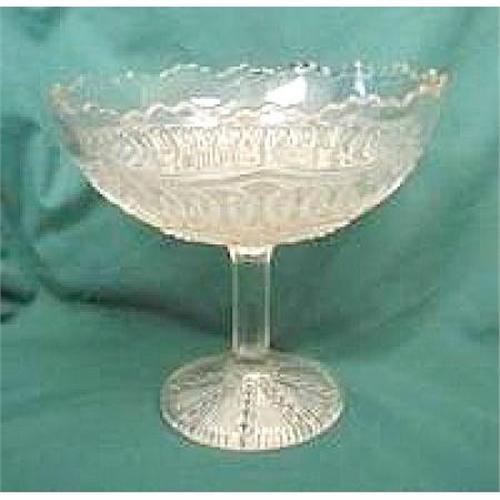 Lovely EAPG clear compote or comport made in 1912 by the J.B. Higbee Glass Co. Yoke and Circle is another name for this New Era pattern. This is the true New Era pattern. Has pretty scalloped edges and pattern as shown. This pattern was produced in over 25 items. <BR>