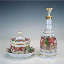 Compotera con tapa y plato en opalina esmaltada con flores. La Granja, h.1820 Altura compotera: 15,5 cms. Diámetro plato: 18,5 cms. Un pelo en el plato.