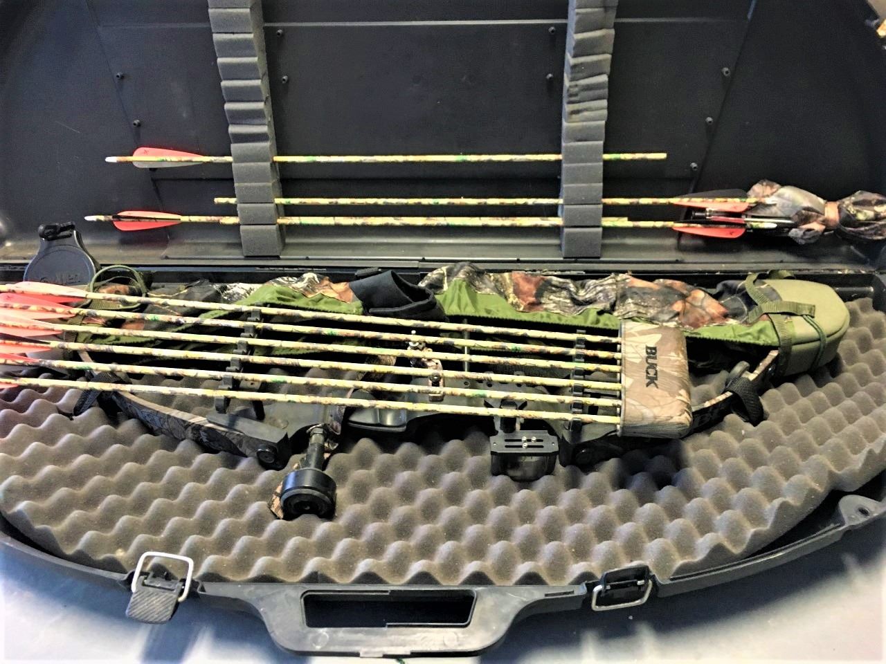 Compound Bow, Arrows and Supplies in Bin