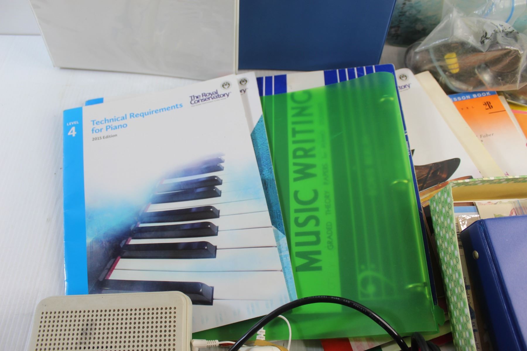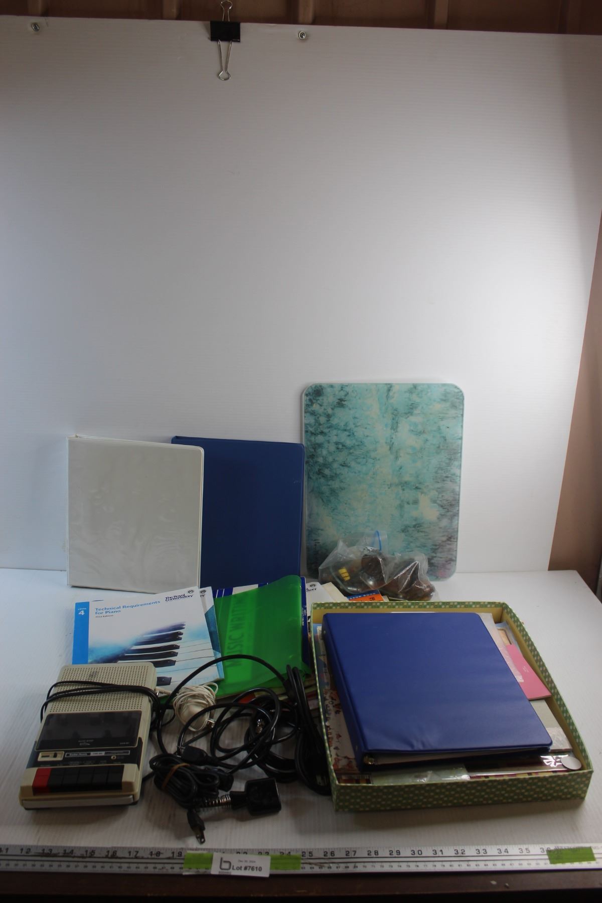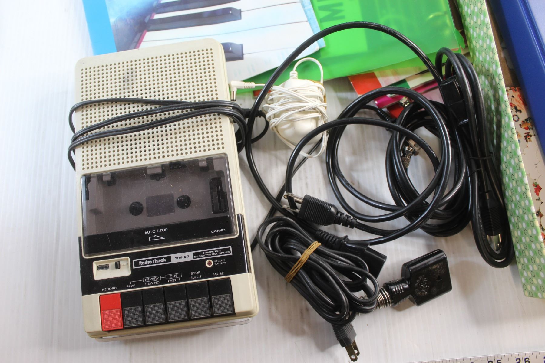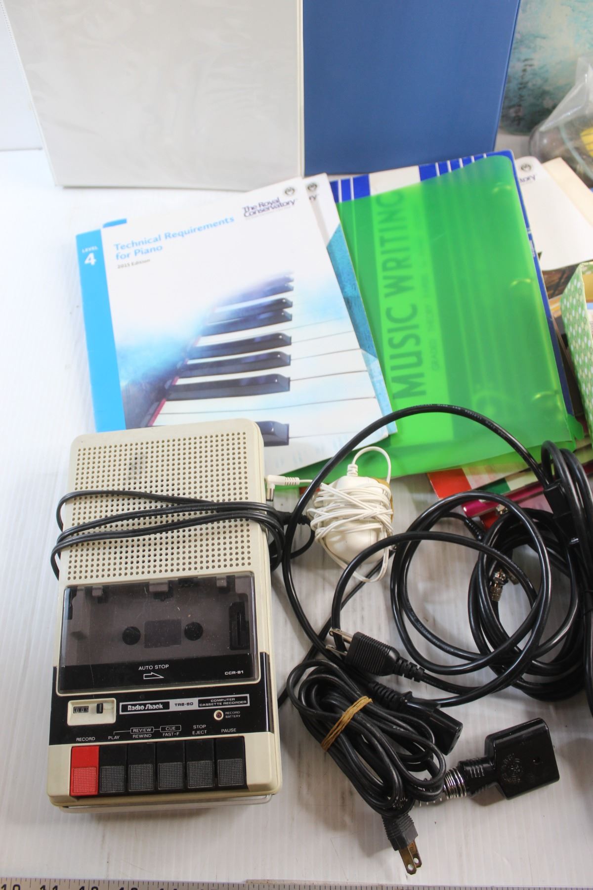 Computer Cassette Recorder, Glass Cutting Board, Piano Magazines, Cords and Misc.