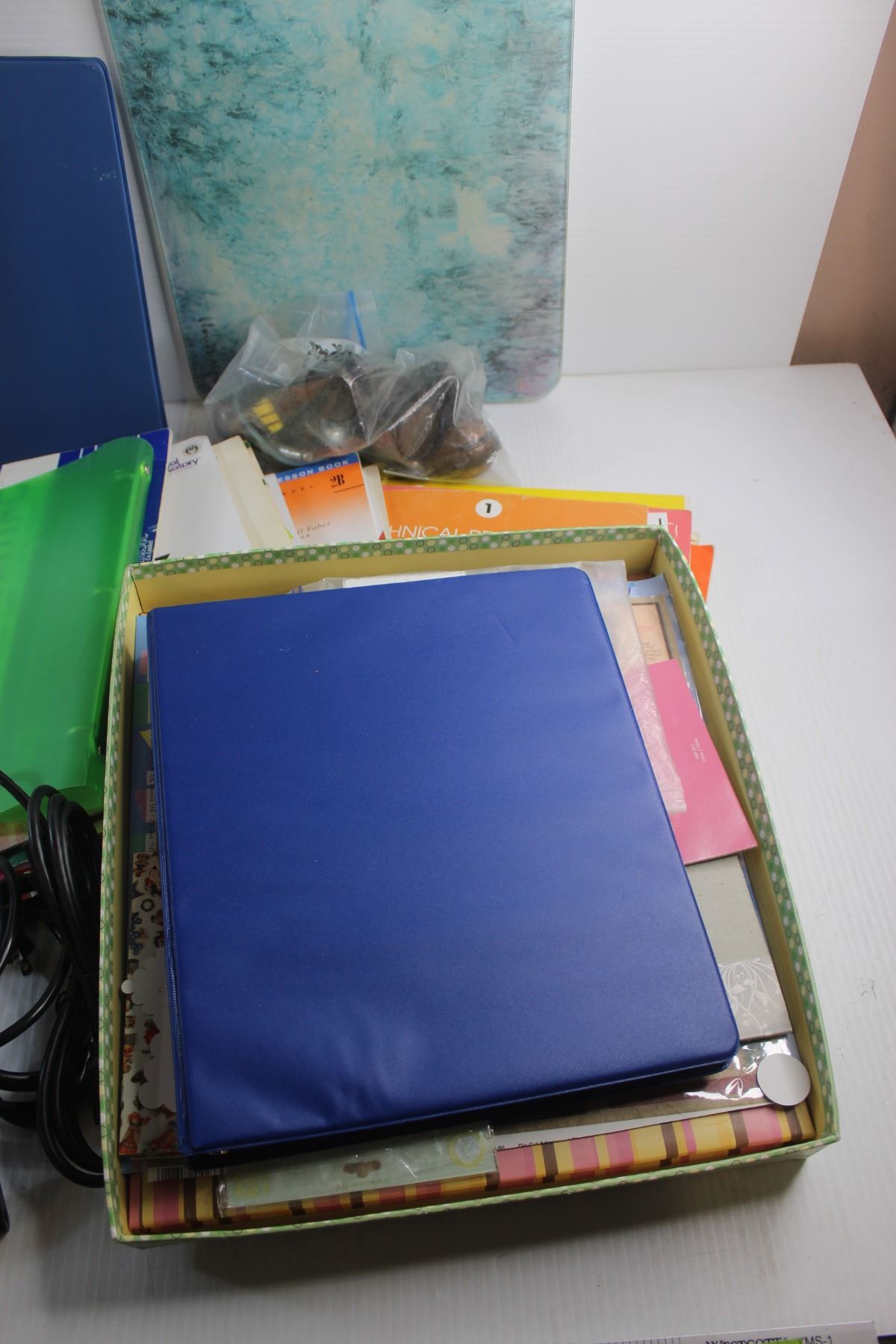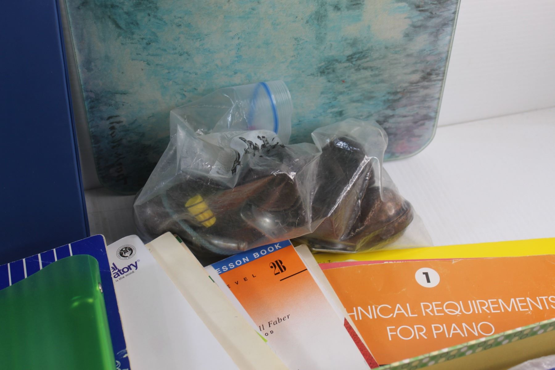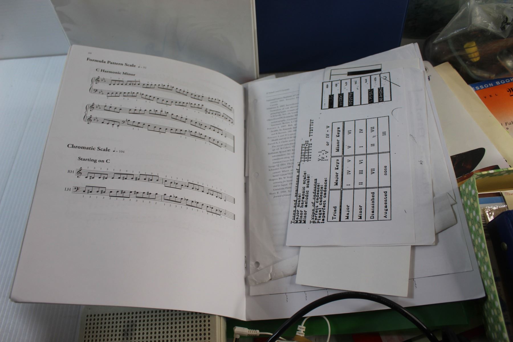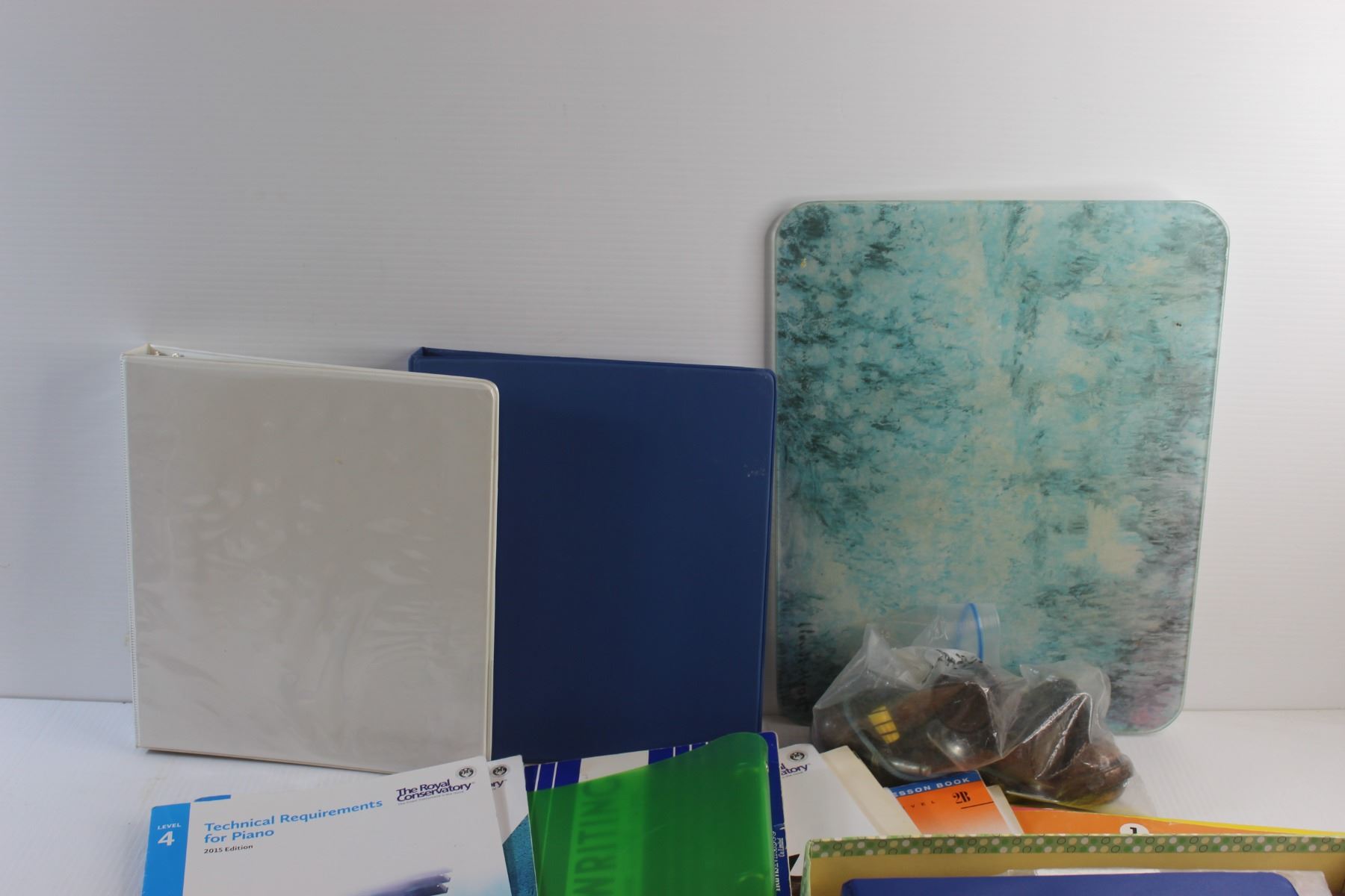 Computer Cassette Recorder, Glass Cutting Board, Piano Magazines, Cords and Misc.