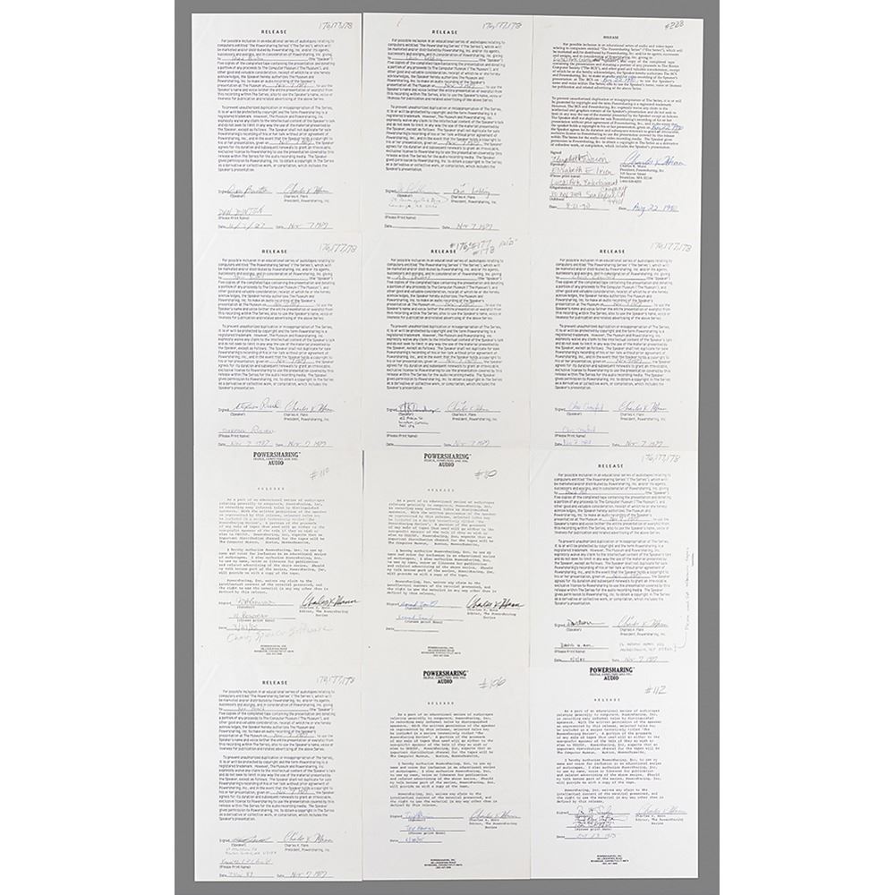 Twelve documents signed by pioneers, developers, and thinkers in the computer and video game industries, each one page, 8.5 x 11, dated from 1985 to 1990, all being releases for Charles Mann's 'Powersharing Series.' Signers are: Trip Hawkins, the founder of Electronic Arts and 3DO; Steve Russell, the creator of Spacewar!, the first widely distributed video game; Chris Crawford, an influential early Atari developer and video game design theorist; Dan Bunten, known for the 1983 game M.U.L.E. (one of the first influential multiplayer video games) and 1984's The Seven Cities of Gold (one of the earliest open world video games); Ken Arnold, a developer of the 1980s dungeon-crawling video game Rogue; Tom Snyder, who developed several educational computer games and introduced the 'Squigglevision' animation technique; Bill Bowman, co-founder of Spinnaker Software; Leonard Tramiel, the vice president of software at Atari; David H. Ahl, the author of BASIC Computer Games, the first computer book to sell more than a million copies; A. K. Dewdney, co-creator of the 1984 programming game Core War; Dave Lebling, a pioneering interactive fiction game designer who co-developed Zork; and Elizabeth Irion, a representative of LucasArts Entertainment. In overall fine condition.