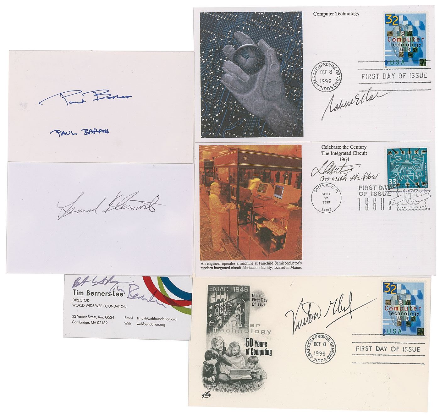 Collection of six items signed by computer pioneers, including: Paul Baran (signature), Tim Berners-Lee (business card), Leonard Kleinrock (signature), Bob Kahn (FDC), Lawrence Roberts (FDC), and Vint Cerf (FDC). In overall very fine condition.