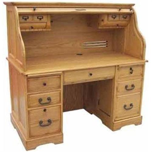 Nice large Roll Top Desk , Designed for computer equipment. Has two acess doors for computer tower and wiring. CPU roll out tray. Flip down drawer front for keyboard. drawers have solid wood sides and bottoms and are constructed using dovetail joinery for strong lasting drawers. Available in light distressed satin lacquer as shown or in harvest distressed(medium oak) or in darker Glazed Medium satin lacquer finish. File drawer holds letter or legal size folders. 54" wide x 28.5" deep desk top x 53.5" height. Ships on common carrier in 3 cartons. Each pedestal is assembled in a carton and the assembled Roll Top is in a carton. Takes two people about 1/2 hr to unpack and assemble. place the pedestals close to final destination and secure back knee hole panel with provided bolts that screw into threaded holes .Secure keboard tray box with the threaded bolts and threaded holes . Place assembled roll top on the pedestals, lining up the four dowells. secure top to pedestals with provided screws if desired. Usually arrives within 10 days or less from order date. This is a quality built desk with close attention given to the details. made, meeting American Lifestyle quality specifications. Price shown includes shipping and insurance.