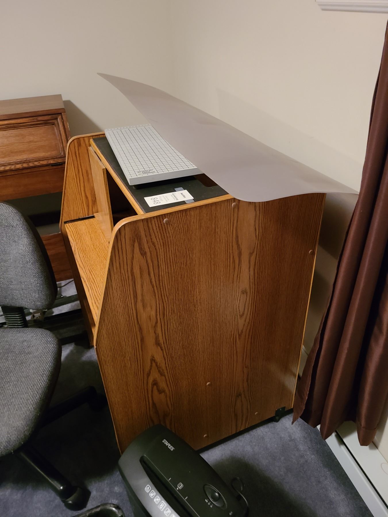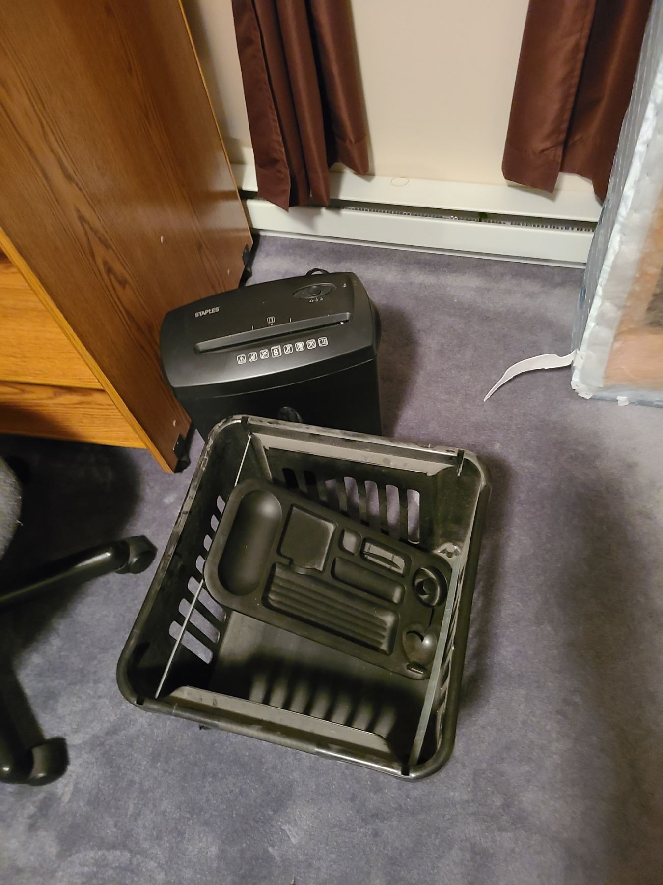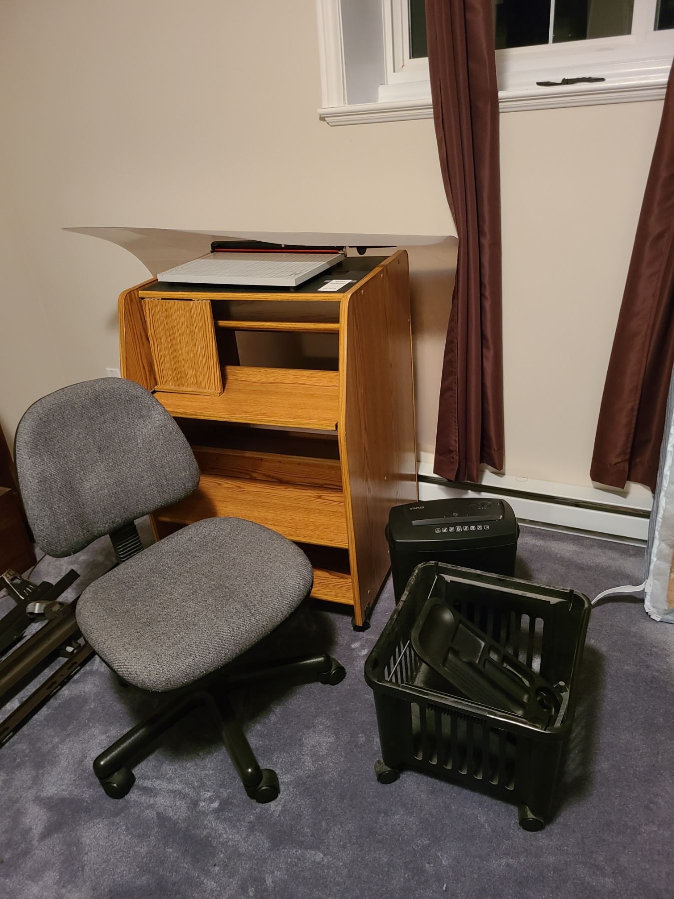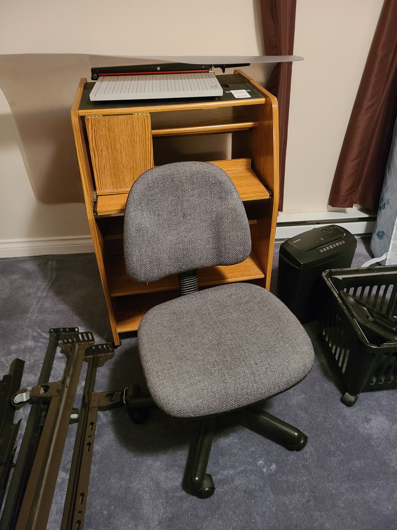Computer desk, office chair, plastic matt for under chair and shredder pickup at 11 am