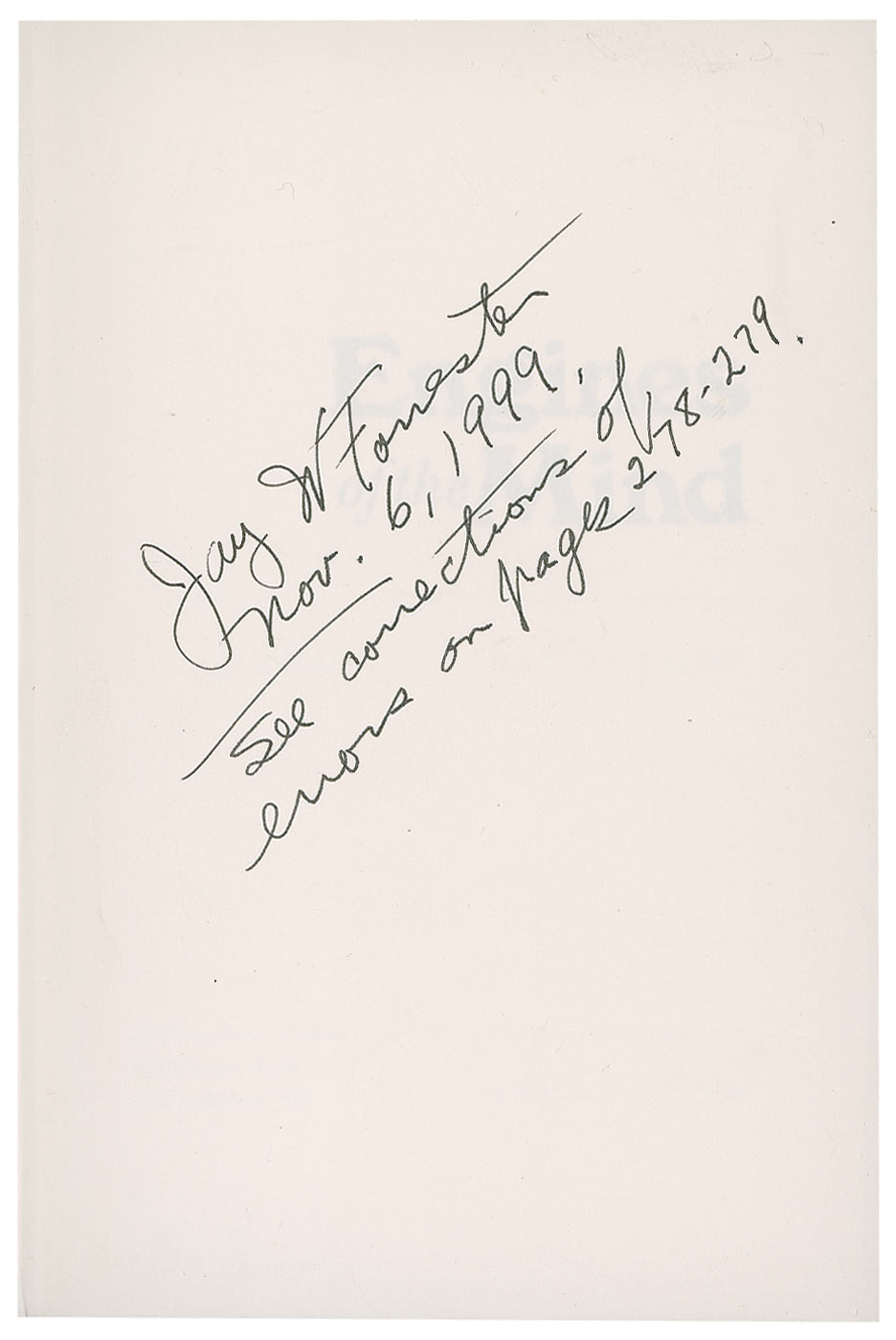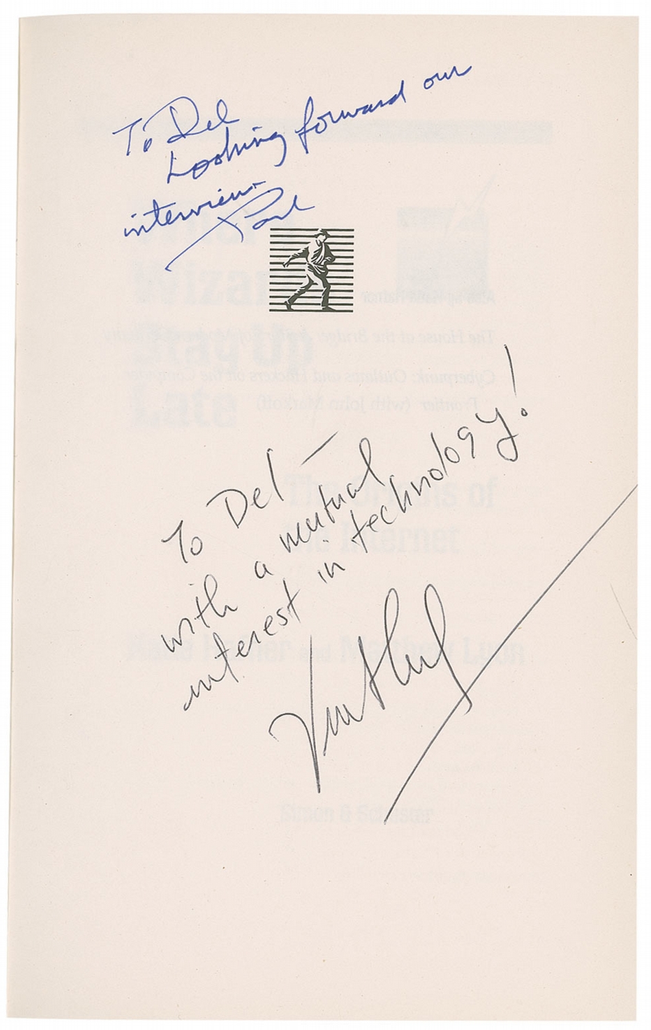 Two hardcover books, each signed on opening pages by National Inventors Hall of Famers: Engines of the Mind: A History of the Computer, signed in black felt tip by Jay Forrester, adding a date; and Where Wizards Stay Up Late, signed in blue felt tip by Paul [Baran] (Ins) and in black ballpoint by Vinton Cerf (ins). In very good condition, with surface rubbing and a loose hinge to the first book, and surface rubbing and a tear at the bottom of the spine on the second book. Paul Baran and Vinton Cerf are considered the two fathers of the internet.