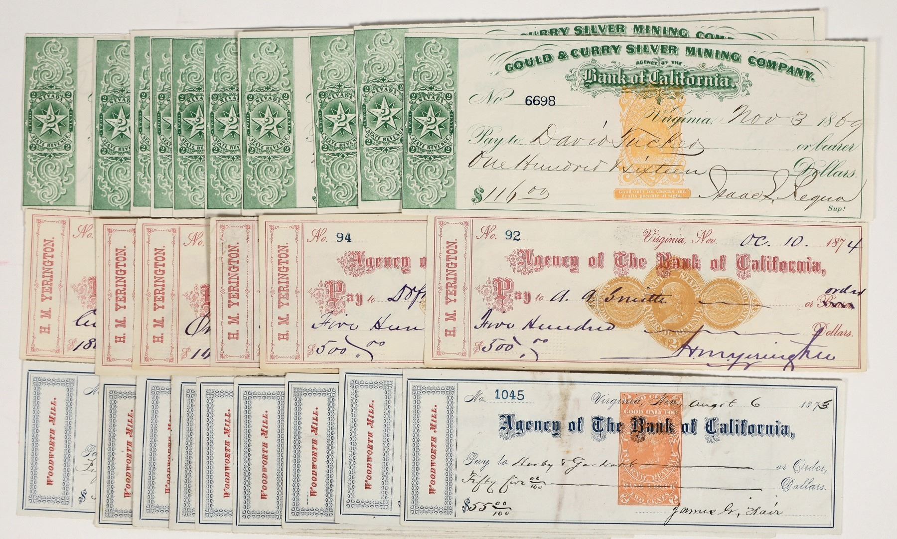 Lot of 27 RN checks. 1) Seven signed HM Yerington with RN-D in buff. Yerington was supt. of the Virginia & Truckee Railroad. 2) Nine Woodworth Mill signed by James G Fair, RN-E. 3) Eleven Gould & Curry signed by Isaac Requa with green printed stamp and RN-B.