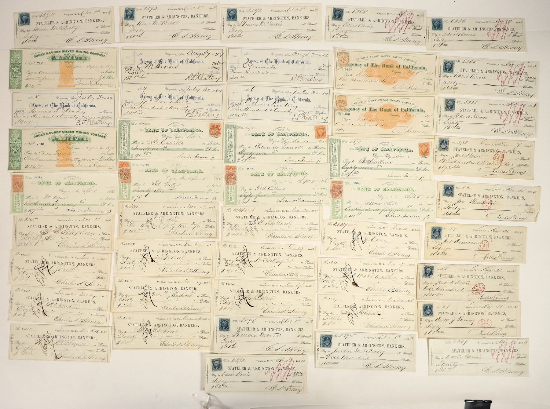 Lot of 46. Nearly all are for the Gould & Curry Mine. This group spans 1862-1884. Includes: 30 territorial Stateler & Arrington checks, 1862-64, signed by either Charles Strong or Charles Bonner, some with red bank cancels; seven Gould & Curry checks issued 1865-66, signed by Louis Janin, some with NV revenue stamps; two 1870 Gould & Curry checks signed by Isaac Requa, RN-B plus printed green NV stamps; two 1871 G&C checks with RN-C plus tied NV adhesive stamps, signed by CC Batterman; and five 1884 checks signed by RP Keating (likely as supt. for the Savage Mine).