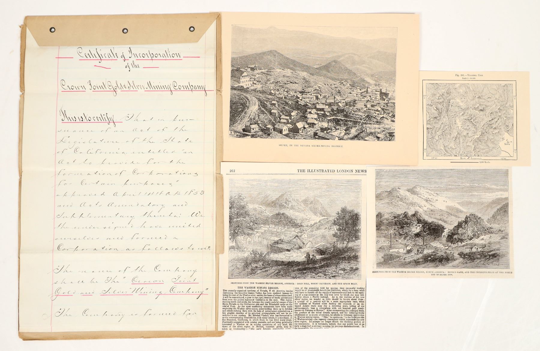 Lot of 4. 1) Articles of Incorporation for the Crown Point Gold & Silver Mining Company. 1879 copy of the 1861 document. Signed by president Weller and secretary Newlands. Site of the Crown Point-Belcher Bonanza in 1870. Gold Hill mine. 2) Four engravings of Comstock scenes: birds-eye of VC; Devil's Gate mill; Mt. Davidson; and more.
