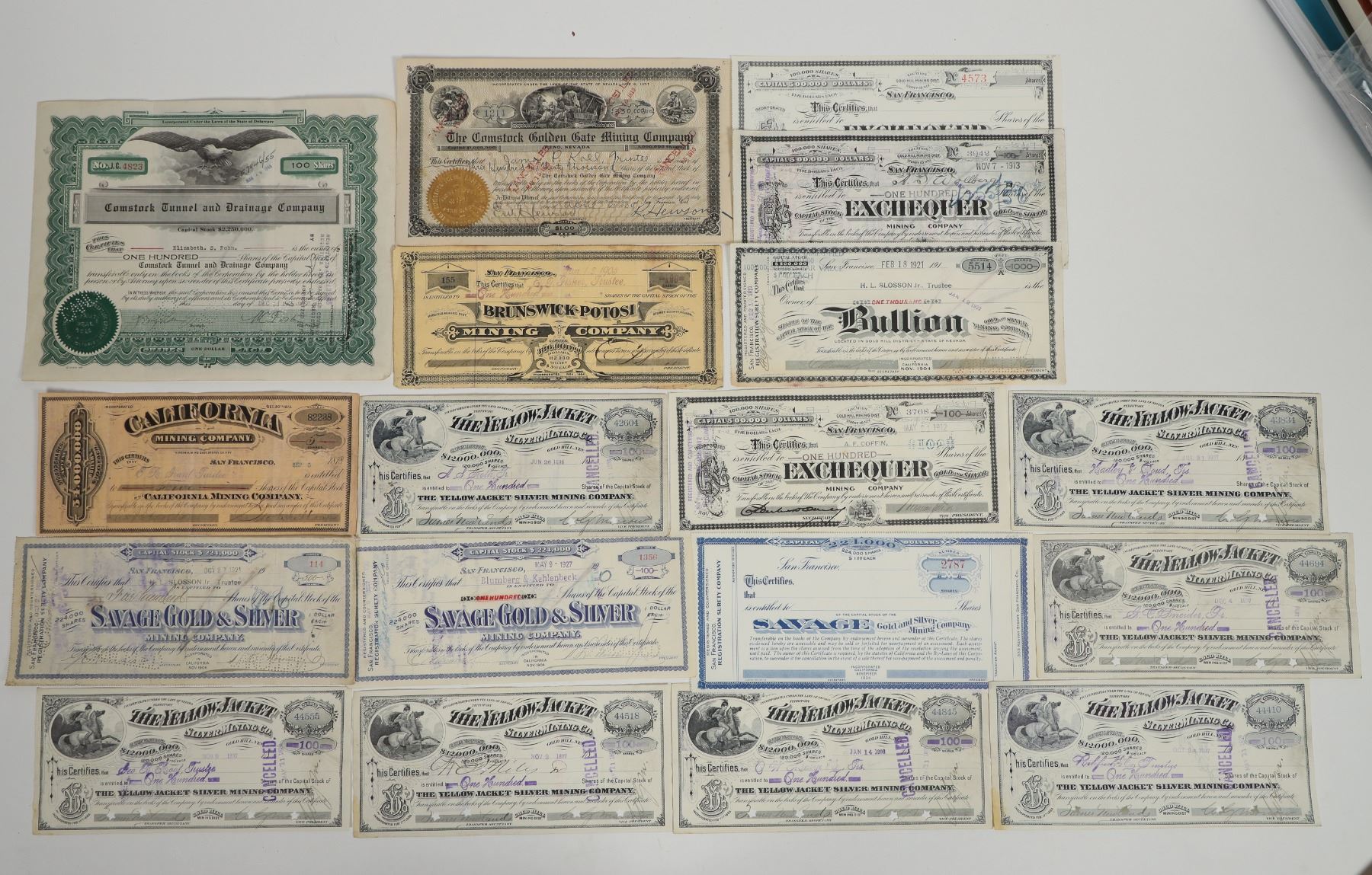 Group of 18 stock certificates from Comstock Lode mining companies, dated 1878 to 1945. Companies represented in the lot include Exchequer Mining Co. (2), The Comstock Golden Gate Mining Co., The Yellow Jacket Silver Mining Co. (7), Savage Gold & Silver Mining (3), California Mining Co., Brunswick-Potosi Mining Co., and the Comstock Tunnel and Drainage Company. 13 certificates cancelled, 2 unissued. Certificates vary in size and condition; see photos.