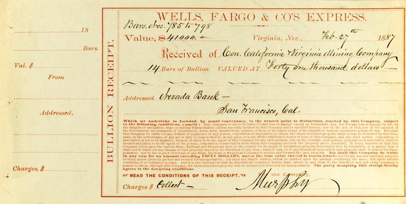 Bullion receipt issued Feb. 27, 1887 by Wells, Fargo & Co.s Express for 14 bars (785 to 798) of bullion. Value set at $41,000. Cons. California and Virginia Mining Co. owned by John Mackay, James Graham Fair, James Flood, and William O'Brien discovered the "Big Bonanza" at Virginia City (orebody over 1200 feet deep). Addressed to Nevada Bank, San Francisco, CA (at one time, the largest bank in America, also owned by the four partners). Signed by Murphy. Red on white. Three small punches at right. Fine. 11" x 5.5".