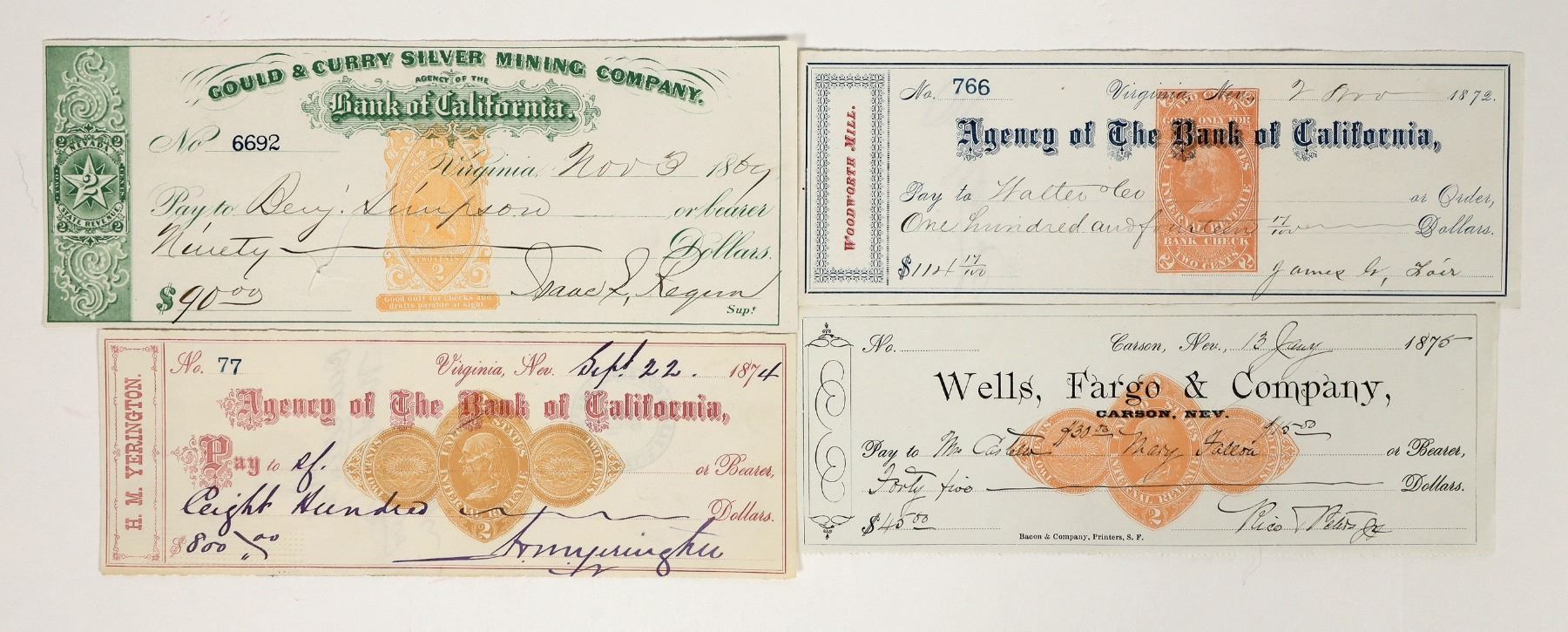 Group of 4 different RNs on Comstock companies. Includes: Woodworth Mill signed by James G. Fair, HM Yerington signed by Yerington, Gould & Curry signed by Requa, and Carson Wells Fargo signed by Rice & Peters. RN-B, RN-D (buff and regular), and RN-E. Nice lot!