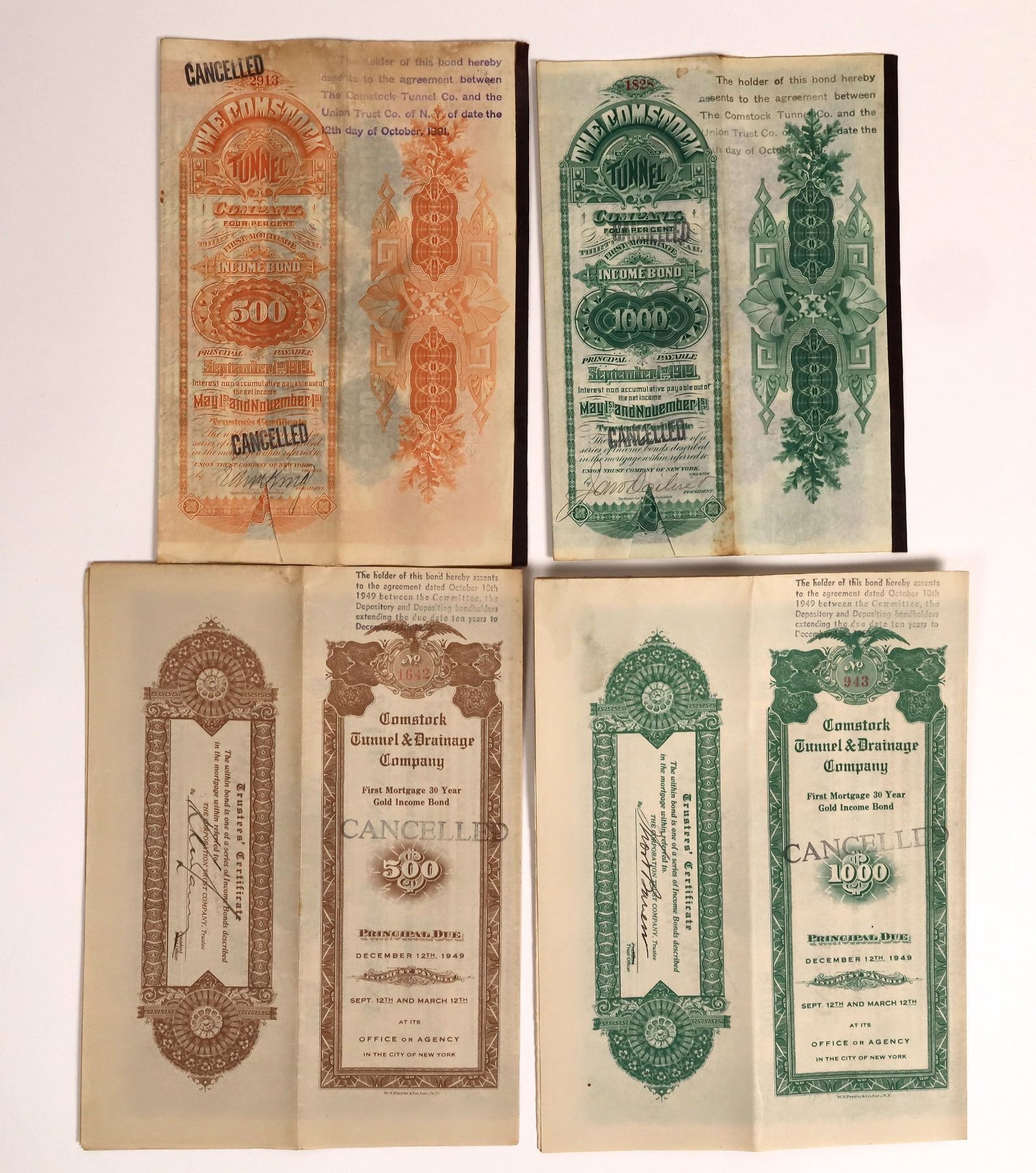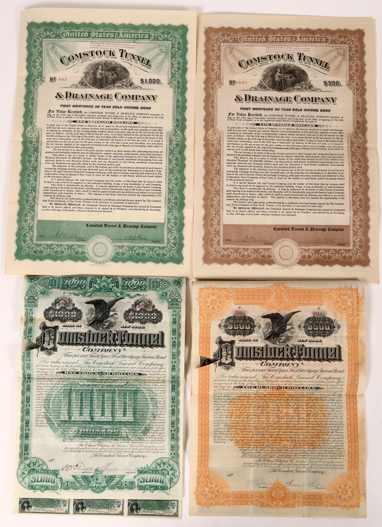 Lot of 4 different 1919 Bonds. 1) Green $1000. 1919. All Coupons attached. 2) Brown $500. All Coupons attached. 3) Orange $500. Signed by president Theodore Sutro. Coupons 5-80 attached. Cut cancelled, 4) Green $1000. Coupons 5-80 attached. Signed by Sutro. Cut cancelled. This was the reorganization of the Sutro Tunnel Company after Adolph Sutro's departure. $500 and $1,000, both issued in 1889, signed by Theodore Sutro as president and the secretary. Cut cancelled. Eagle vignette. Each has coupons attached.