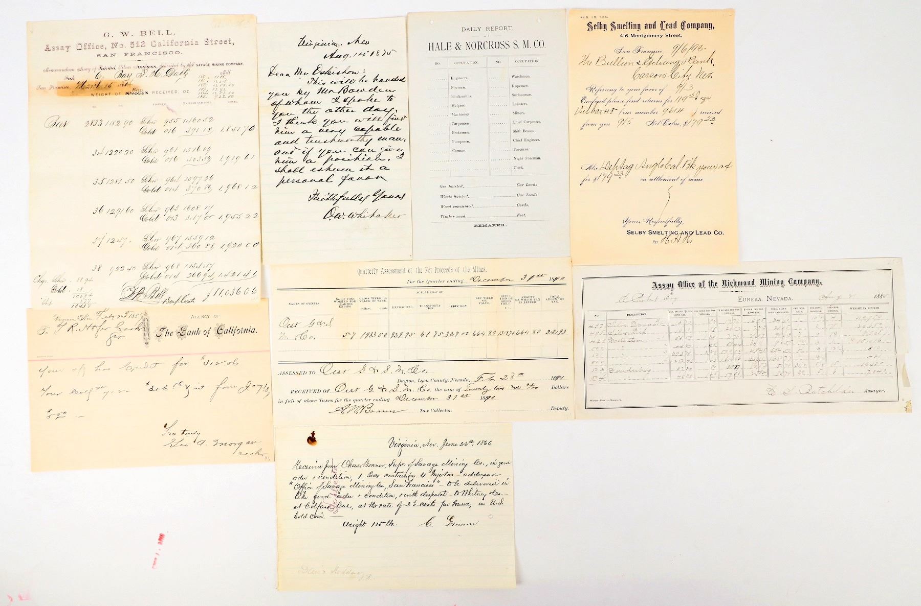 Lot of 8. Nice group that includes: March 1864 assay sheet from GW Bell for the Savage Mine in Virginia City; 1875 letter from Virginia City to mine supt. Osbiston introducing Mr. Bowden for possible employment; Bank of California 1887 billhead, Virginia City; Quarterly Assessment of the Net Proceeds of the Mines, Dayton, Nevada, 1890, for the Oest Gold & Silver Mining Co. of Lyon County (Comstock adjacent); 1866 Virginia manuscript document for 4 injectors for the Savage Mine; Daily Report for the Hale & Norcross Mine, Virginia City, unused; Selby Smelting & Lead Co. receipt for the Bullion & Exchange Bank for returns on a silver bar, 1898; and a rare Richmond Mining Company assay form, Eureka, Nevada, 1885.