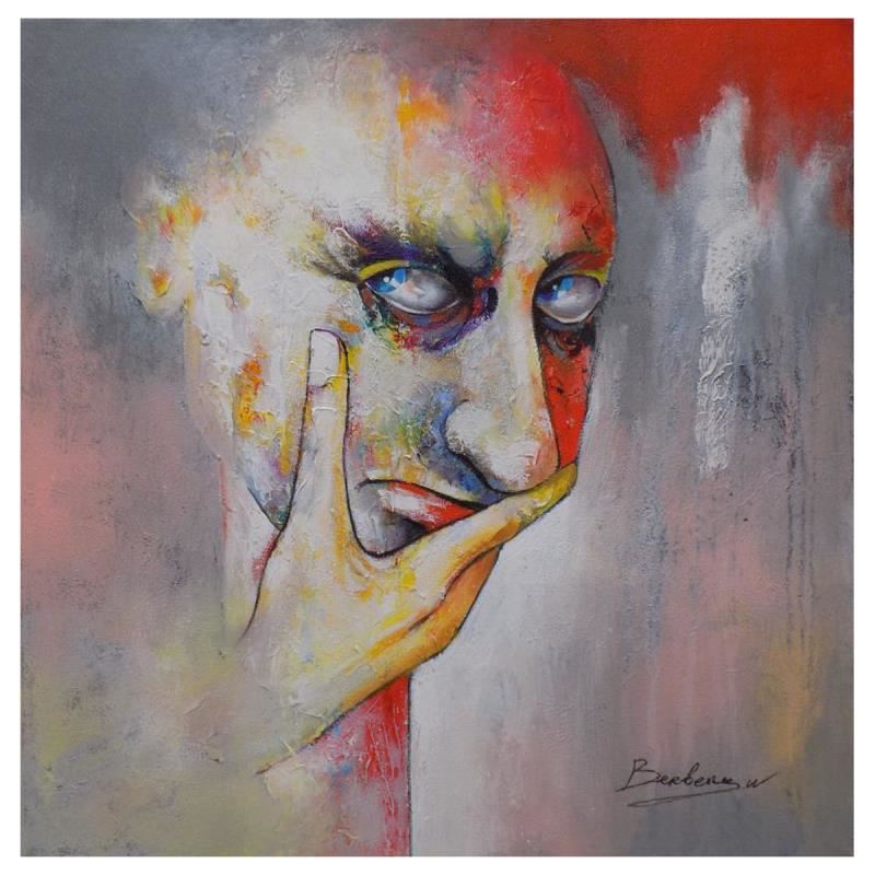"Con Artist""&" is an original acrylic mixed media painting on canvas by Ara Berberyan. The piece is hand signed and comes with a letter of authenticity. Measures approximately 24" x 24".