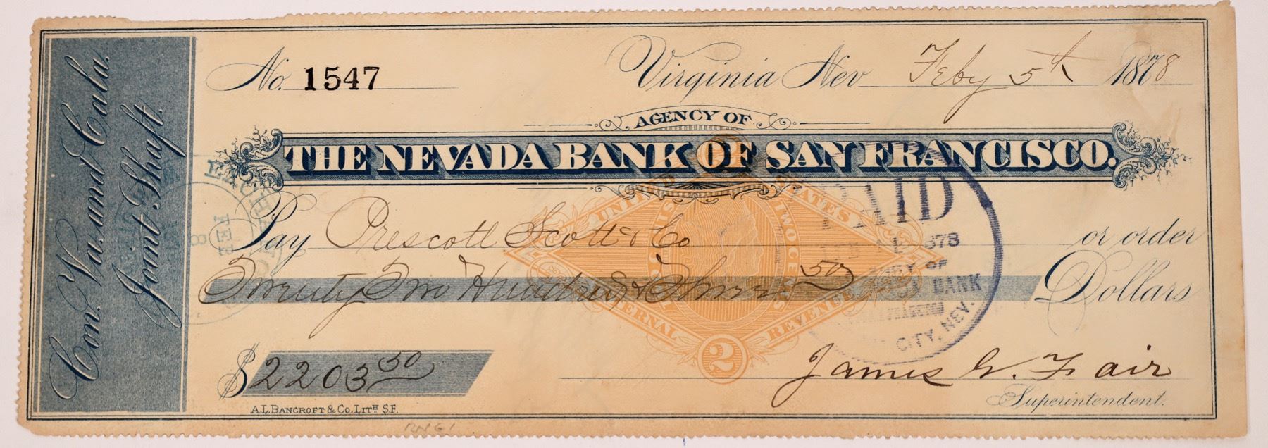 Ultra rare Comstock RN check. No. 1547, issued Feb. 5th, 1878 to Prescott & Co. for $2,203.50. Signed by "Bonanza King" James G. Fair as superintendent. RN-G. Cut cancel, some toning. This was the site of the Big Bonanza discovery in 1873. City:Virginia City State:Nevada Date:1878