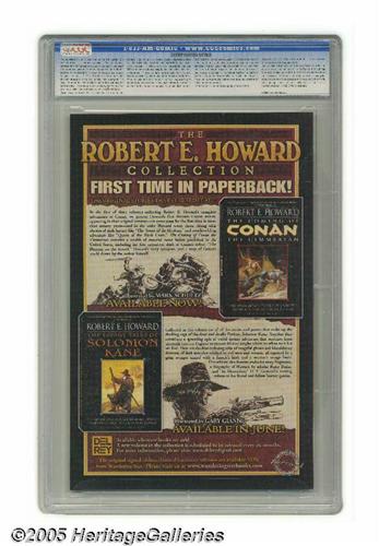 <B>Conan #1 Second Printing (Dark Horse, 2004) CGC MT 10.0 White pages.</B></I> Gem Mint copy. Bondage cover by J. Scott Campbell. Cary Nord art. Overstreet 2005 NM- 9.2 value = $3. CGC census 1/05 (for the second printing only): 2 in 10.0. <I>From the collection of Chris Bell.</B></I>