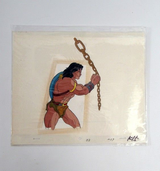 From the original "Conan: The Adventurer" (1992) TV series these are two original hand-painted production animation cels, beautifully detailed showing Conan about to swing out of a window on a massive hanging chain. They both have the original registration keys and animator's notations. Ready for framing and display. (Approx. 10 1/2" x 12 1/2").