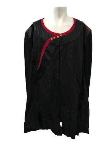 Conan The Destroyer (1984) - Bombaata (Wilt Chamberlain) tunic. "Sony" is written inside the collar. The tunic is black with embroidery detail down the front with red suede like trim collar and a slit in the bottom to appear almost cape like. Arms are made of lighter, crepe type material. A line of velvet material runs down both sides into the back. Back zip and custom made shoulder padding. This was used as a preliminary idea by the wardrobe department and ultimately used for testing purposes.