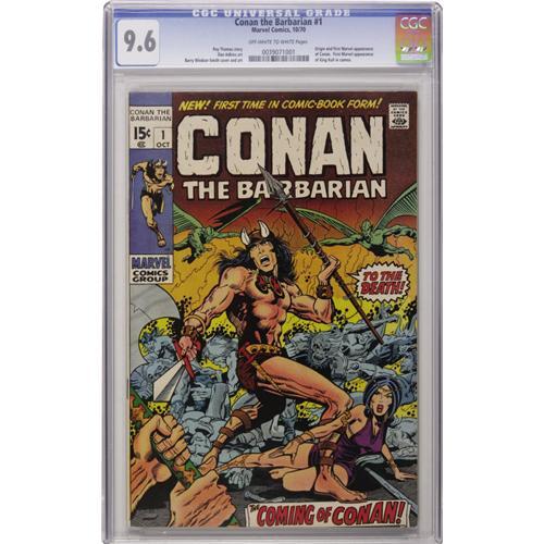 <B>Conan the Barbarian #1 (Marvel, 1970) CGC NM+ 9.6 Off-white to white pages.</B></I> The '60s saw upstart Marvel dethrone DC as King of Comics, and Stan Lee's House of Ideas started the next decade with this blockbuster. With its unique theme and a relatively "new," distinctive artist in Barry Smith, <B>Conan</B></I> was an immediate hit. Besides featuring the origin and first Marvel appearance of Conan, this issue marked the first appearance of King Kull in a cameo. Although this is a relatively recent book -- relative to Golden and Silver Age issues -- CGC has certified very few nicer copies. This is definitely a book on the rise that's still within <I>your</B></I> reach! Overstreet 2006 NM- 9.2 value = $300. CGC census 9/06: 45 in 9.6, 8 higher.<BR><BR><b>Shipping:</b> Slabbed Comic (<a target="_blank" href="http://www.heritageauctions.com/common/shipping.php">view shipping information</a>)