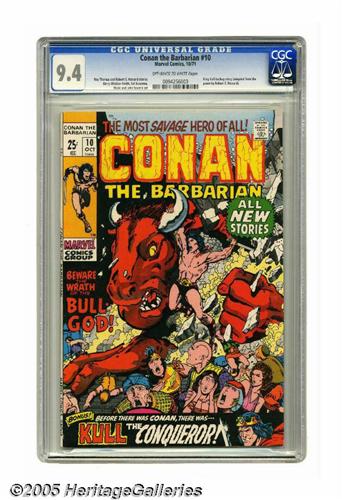 <B>Conan the Barbarian #10 (Marvel, 1971) CGC NM 9.4 Off-white to white pages.</B></I> Barry Smith cover. Conan story with Smith art. King Kull backup feature with John Severin art. Also a reprint of an Atlas Comics Black Knight story with Syd Shores art. Overstreet 2005 NM- 9.2 value = $70. CGC census 4/05: 20 in 9.4, 17 higher.