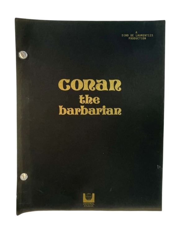 Original script used in the production of the John Milius directed sword-and-sorcery film 'Conan the Barbarian' (1982), which tells the story of a barbarian warrior named Conan (Schwarzenegger) who seeks vengeance for the death of his parents at the hands of Thulsa Doom (Jones), the leader of a snake cult.