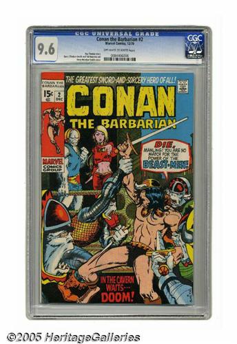 <B>Conan the Barbarian #2 (Marvel, 1970) CGC NM+ 9.6 Off-white to white pages.</B></I> At the time of this second issue, Marvel only had the rights to the Conan character, not Robert E. Howard's stories. But Roy Thomas penned an original tale here, "Lair of the Beast-Men," that's very moving indeed. Barry Smith provided the visuals as usual. Overstreet 2005 NM- 9.2 value = $80. CGC census 3/05: 14 in 9.6, 5 higher.