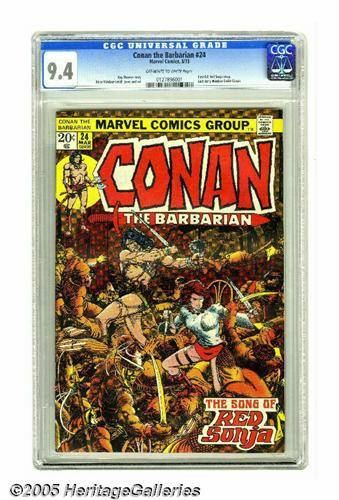 <B>Conan the Barbarian #24 (Marvel, 1973) CGC NM 9.4 Off-white to white pages.</B></I> First full Red Sonja story. Barry Smith's last issue as penciler of the title. Overstreet 2005 NM- 9.2 value = $38. CGC census 3/05: 33 in 9.4, 35 higher.