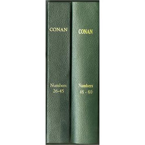 <B>Conan the Barbarian #26-60 Plus Bound Volumes (Marvel, 1973-75).</B></I> In addition to issues #26-60 of the regular series, these two dark green hardcover volumes also contain <B>Giant-Size Conan</B></I> #1-5. The titles and issue numbers are embossed on the spines (not mentioning the <B>Giant-Size</B></I> books), and the name of the previous owner is embossed on the covers of the volumes. Note that issues #26-45 which comprise the first volume have not been trimmed prior to binding, while the rest in the second volume have been trimmed in the usual fashion. Overstreet VG 4.0 value for group = $110.