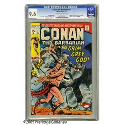 <B>Conan the Barbarian #3 (Marvel, 1971) CGC NM+ 9.6 Off-white to white pages.</B></I> The third issue of this title was the first to be adapted from a Robert E. Howard story. Howard's original was a non-Conan tale set in ancient Ireland, "The Grey God Passes," which Roy Thomas adapted to include the Cimmerian. The cover and interior art are by Barry Smith. According to Overstreet, this issue experienced low distribution in some areas. Overstreet 2004 NM- 9.2 value = $210. CGC census 12/04: 8 in 9.6, none higher.