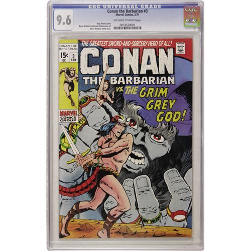 <B>Conan the Barbarian #3 (Marvel, 1971) CGC NM+ 9.6 Off-white to white pages.</B></I> When this series began, Marvel only had the rights to the Conan character, not Robert E. Howard's stories. But Roy Thomas and Co. struck a deal here to adapt a story called "The Grey God Passes," changing Howard's tale, which was set in ancient Ireland, to include Conan. Barry Smith drew both the story and the cover. The issue experienced low distribution in some areas of the country according to Overstreet. Overstreet 2006 NM- 9.2 value = $185. CGC census 10/06: 13 in 9.6, 1 higher.<BR><BR><b>Shipping:</b> Slabbed Comic (<a target="_blank" href="http://www.heritageauctions.com/common/shipping.php">view shipping information</a>)
