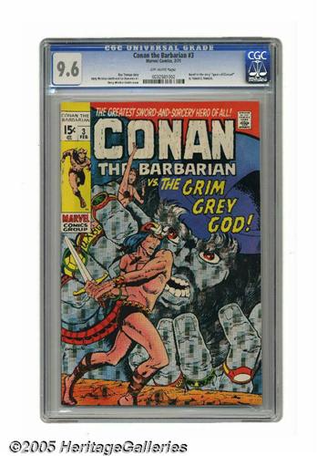 <B>Conan the Barbarian #3 (Marvel, 1971) CGC NM+ 9.6 Off-white pages.</B></I> Based on the story "The Grey God Passes" by Conan creator Robert E. Howard. This issue experienced low distribution in some areas. Barry Windsor-Smith cover. Windsor-Smith and Sal Buscema art. Overstreet 2005 NM- 9.2 value = $150. CGC census 1/05: 7 in 9.6, one higher.