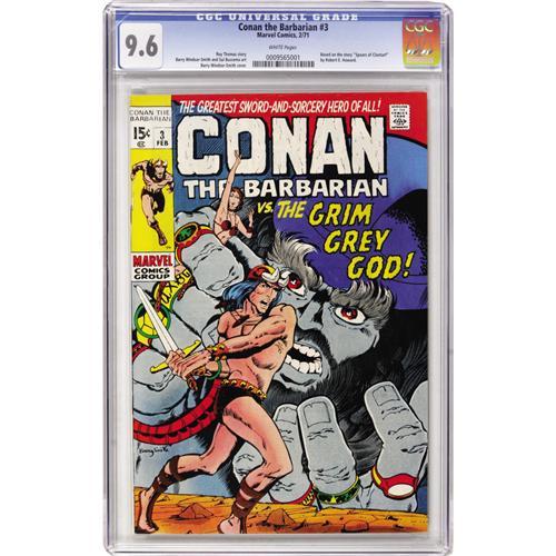 <B>Conan the Barbarian #3 (Marvel, 1971) CGC NM+ 9.6 White pages.</B></I> When this series began, Marvel only had the rights to the Conan character, not Robert E. Howard's stories. But Roy Thomas and Co. struck a deal here to adapt Howard's "The Grey God Passes," changing the set from ancient Ireland to Conan's Hyborian Age. (CGC erroneously lists the source as "Spears of Clontarf.") Barry Smith drew both the story and the cover. According to Overstreet, this issue experienced low distribution in some areas of the country. Overstreet 2006 NM- 9.2 value = $185. CGC census 3/07: 14 in 9.6, 1 higher. <I> From the Janowicz Collection.</B></I><BR><BR><b>Shipping:</b> Comics - Slabbed (certified) (<a target="_blank" href="http://www.heritageauctions.com/common/shipping.php">view shipping information</a>)