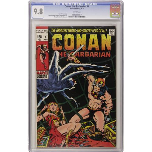 <B>Conan the Barbarian #4 (Marvel, 1971) CGC NM/MT 9.8 White pages.</B></I> Near perfect copy is unsurpassed in CGC's current census, and the white page quality is the cherry on top. Roy Thomas (writer) and Barry Smith (art) at their best. Overstreet 2006 NM- 9.2 value = $85. CGC census 9/06: 4 in 9.8, none higher.<BR><BR><b>Shipping:</b> Slabbed Comic (<a target="_blank" href="http://www.heritageauctions.com/common/shipping.php">view shipping information</a>)