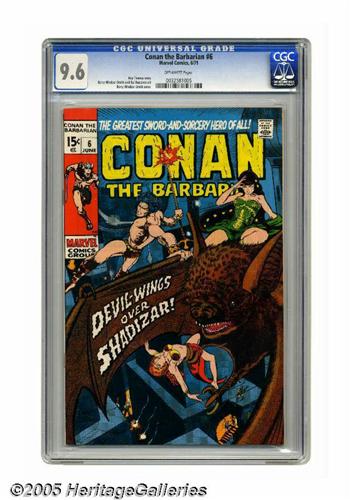 <B>Conan the Barbarian #6 (Marvel, 1971) CGC NM+ 9.6 Off-white pages.</B></I> Barry Smith cover. Smith and Sal Buscema art. Overstreet 2005 NM- 9.2 value = $50. CGC census 4/05: 12 in 9.6, 3 higher.
