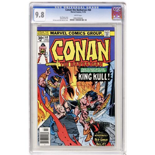 <B>Conan the Barbarian #68 (Marvel, 1976) CGC NM/MT 9.8 White pages.</B></I> King Kull and Red Sonja appear. Gil Kane cover. John Buscema art. Overstreet 2004 NM- 9.2 value = $4. CGC census 2/05: 4 in 9.8, none higher.<BR><BR><b>Shipping:</b> Comics - Slabbed (certified) (<a target="_blank" href="http://www.heritageauctions.com/common/shipping.php">view shipping information</a>)