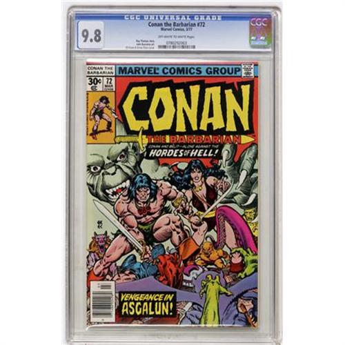 <B>Conan the Barbarian #72 (Marvel, 1977) CGC NM/MT 9.8 Off-white to white pages.</B></I> Gil Kane and Ernie Chan cover. John Buscema art. CGC hasn't awarded a higher grade for this issue to date. Overstreet 2007 NM- 9.2 value = $4. CGC census 10/07: 5 in 9.8, none higher. <I> From the Fantastic Frank Collection.</B></I><BR><BR><b>Shipping:</b> Comics - Slabbed (certified) (<a target="_blank" href="http://www.heritageauctions.com/common/shipping.php">view shipping information</a>)
