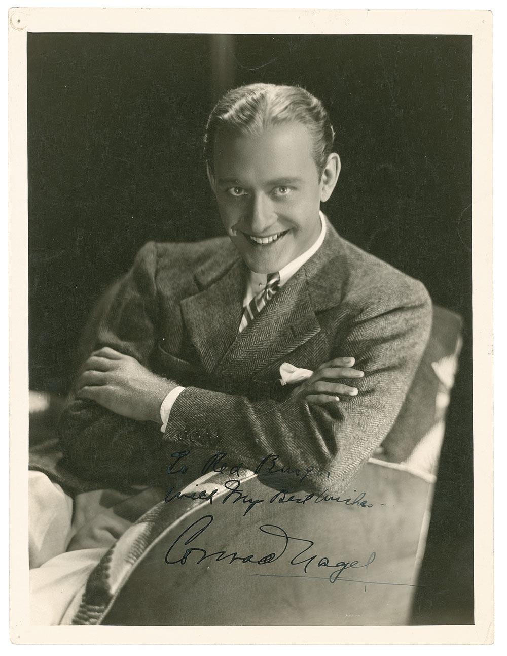 Vintage semi-gloss finish 10 x 13 Hurrell MGM publicity photo, signed and inscribed “To Red Burger, with my best wishes-Conrad Nagel.” In very good condition, with a single tack hole to each corner, scattered light surface rubbing and marks, a couple creases, and some scattered light silvering.