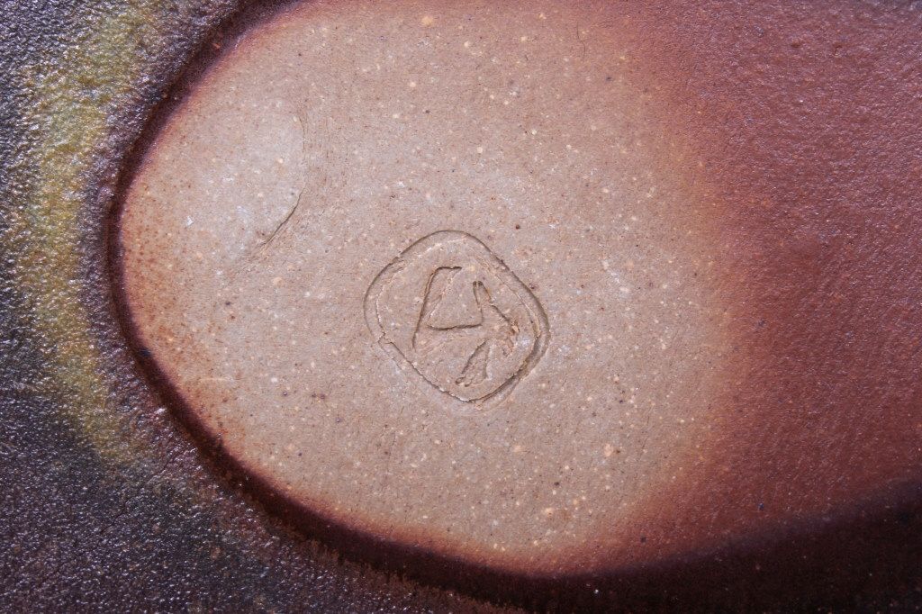 This is a hand formed work of art with an Oriental design from the 20th century. This si signed on with a monogram undetermined. Has earth tone colors and a salt glaze with 4 applied footings. The dimensions 2.25" tall, 11 3/8" long, and 5.75" deep.