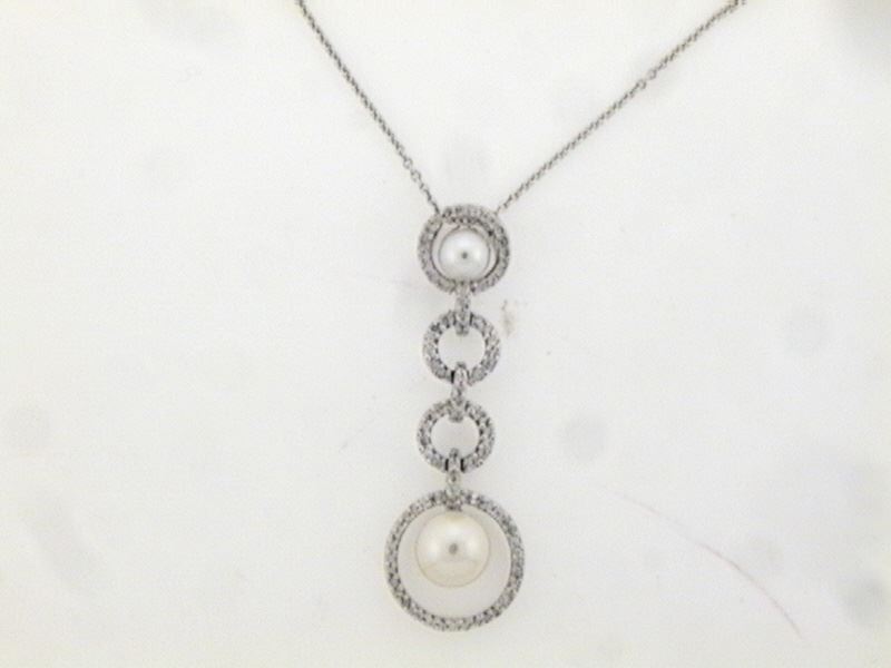 This is a 14 karat white gold pendant showcasing 2 silky cultured pearls with a beautiful silvery and rosy sheen measuring 5-7mm. The pearls are secured with posts and cups and placed in the top and bottom of four circles that contain .43 carats total weight of round, brilliant-cut, H-I color, SI2-I1 clarity diamonds.& nbsp; The pendant is approximately 1.75& quot; long and has two (2) hidden bails to create a slide-style pendant.& nbsp; This item is eligible for appraisal at a discounted rate, from an independent appraiser (with qualifying credentials from GIA) with no affiliation to Bidfair Fine Jewelry. Please contact Bidfair Fine Jewelry for more information on appraisals and sizing. This is a brand new item with manufacturer's approval to sale in a public auction. It is in excellent condition, but may have fine scratches from shipping or storage. Admin: G11241/43ngt