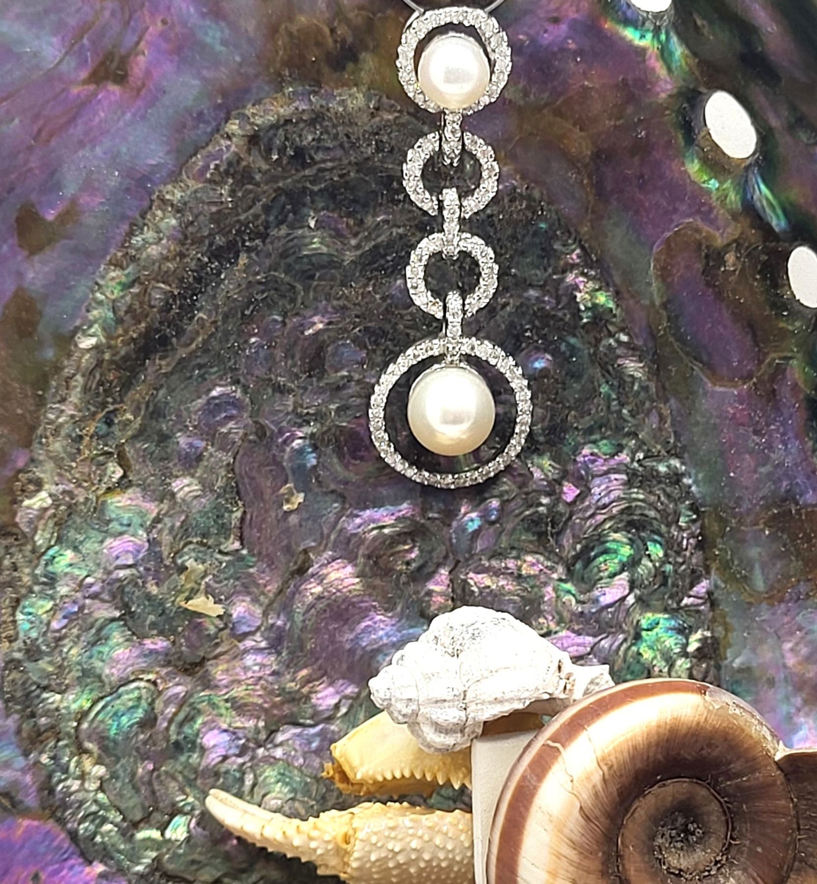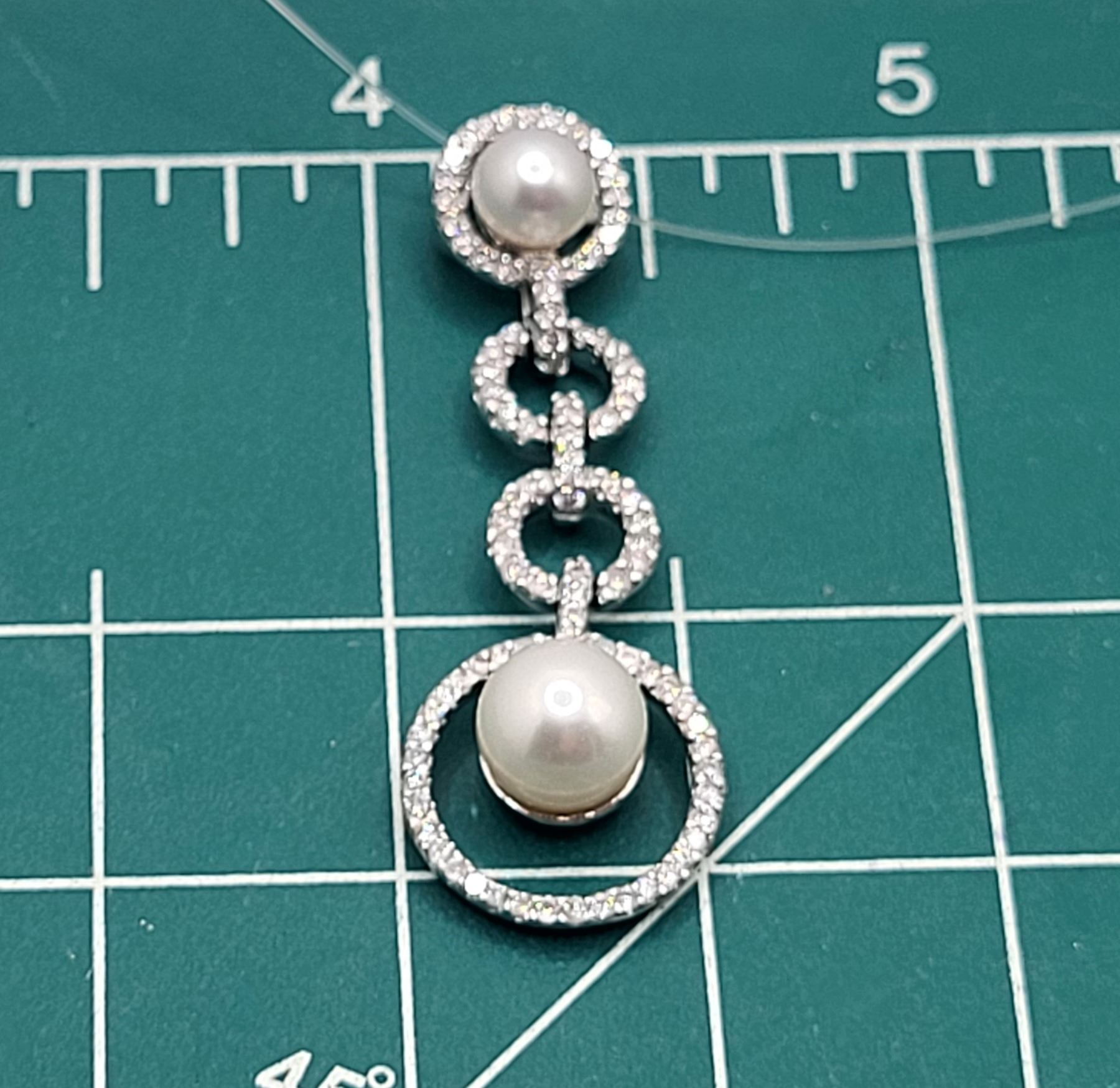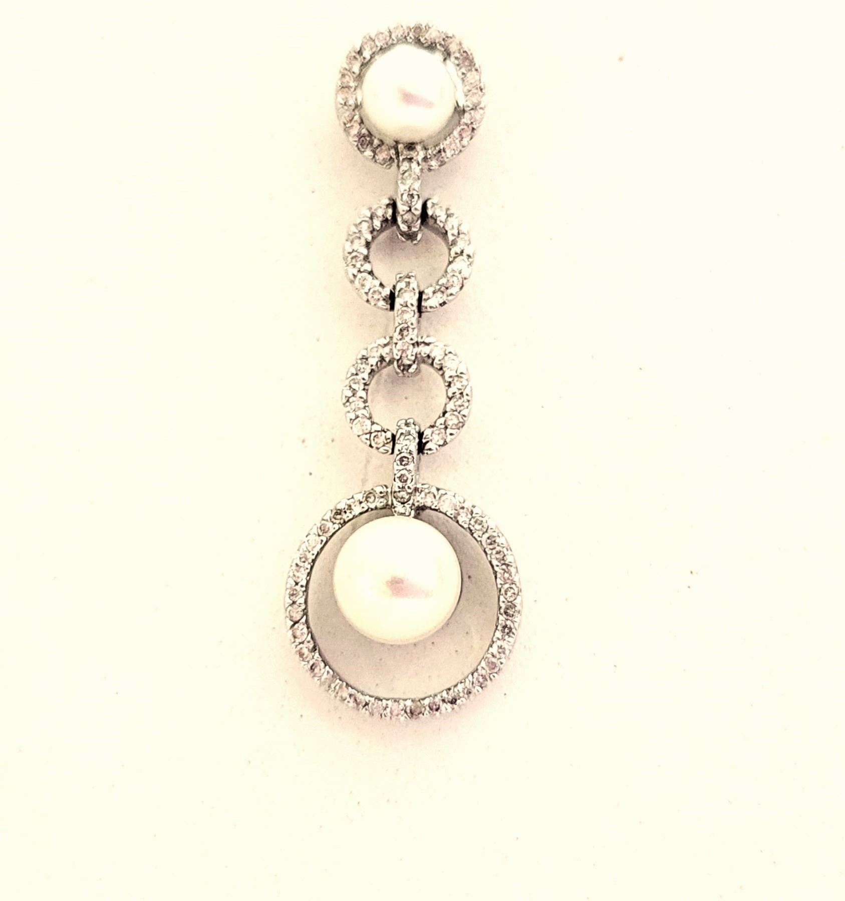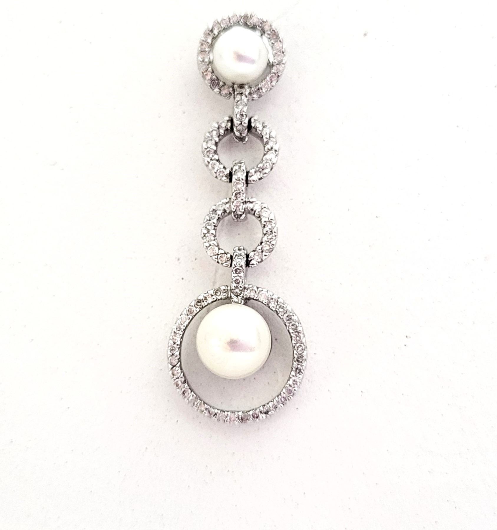 This is a 14 karat white gold pendant showcasing 2 silky cultured pearls, both having beautiful silvery and rosy sheens, and measuring 5-7mm. The pearls are secured with posts and cups and placed in the top and bottom of four circles that contain .43 carats total weight of round, brilliant-cut, H-I color, SI2-I1 clarity diamonds. The pendant is approximately 1.75& quot; long and has two (2) hidden bails to create a slide-style pendant. This item is eligible for appraisal at a discounted rate, from an independent appraiser (with qualifying credentials from GIA) with no affiliation to Bidfair Fine Jewelry. Please contact Bidfair Fine Jewelry for more information on appraisals and sizing.& nbsp; Admin: G11241/43ngt