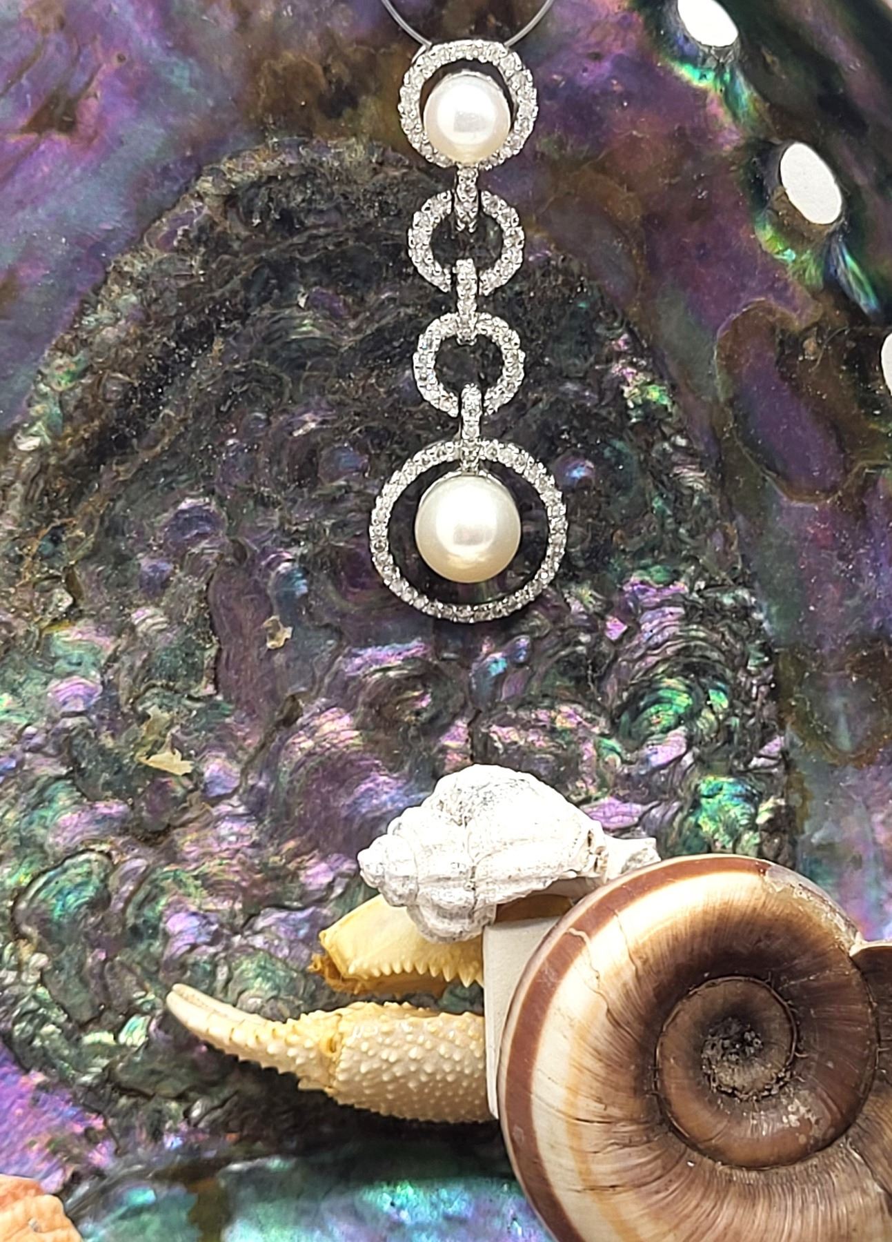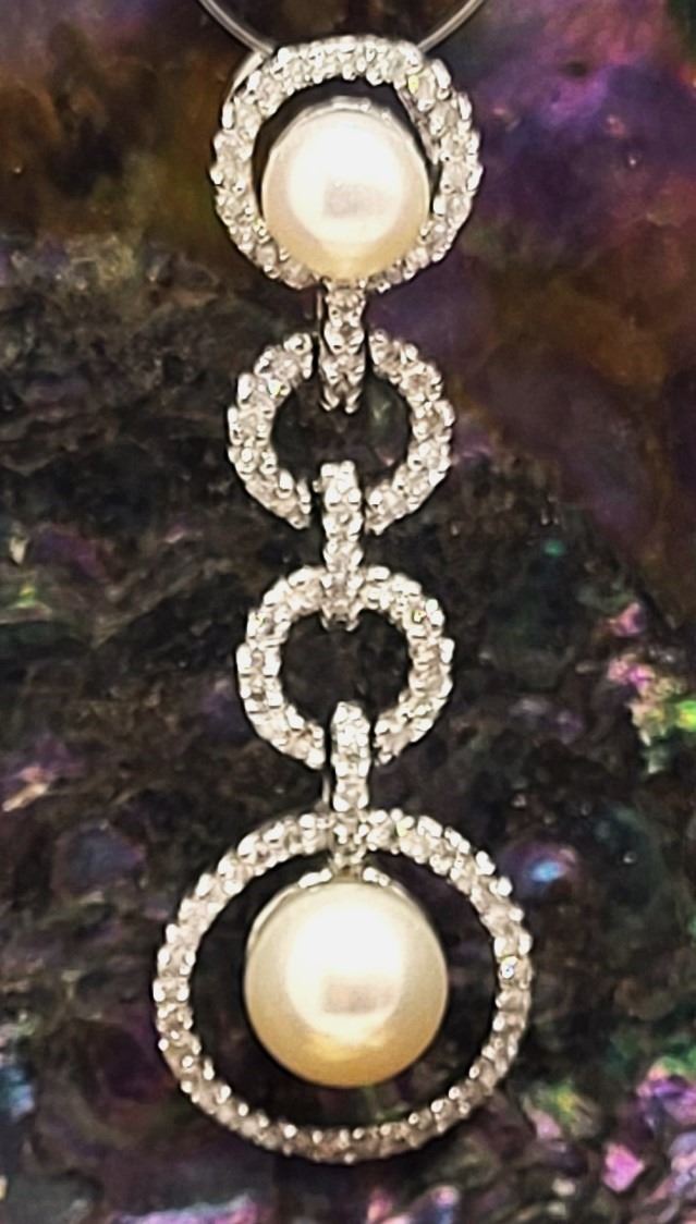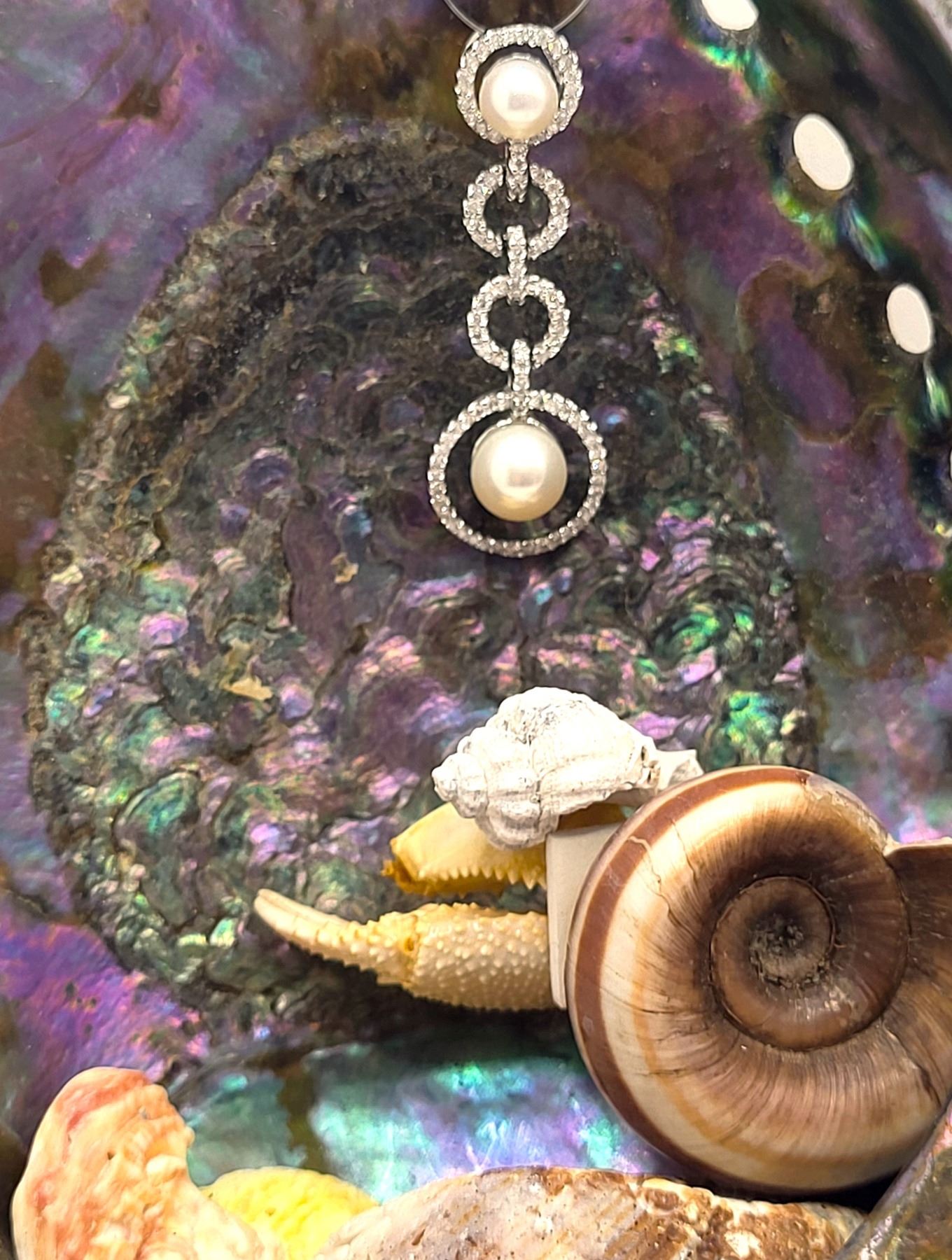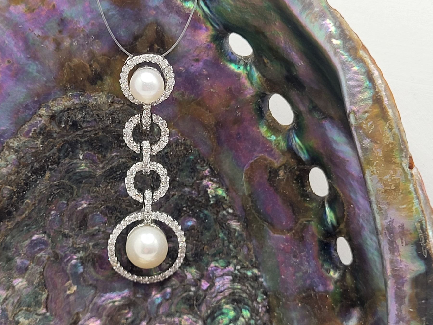 This is a 14 karat white gold pendant showcasing 2 silky cultured pearls, both having beautiful silvery and rosy sheens, and measuring 5-7mm. The pearls are secured with posts and cups and placed in the top and bottom of four circles that contain .43 carats total weight of round, brilliant-cut, H-I color, SI2-I1 clarity diamonds. The pendant is approximately 1.75& quot; long and has two (2) hidden bails to create a slide-style pendant. This item is eligible for appraisal at a discounted rate, from an independent appraiser (with qualifying credentials from GIA) with no affiliation to Bidfair Fine Jewelry. Please contact Bidfair Fine Jewelry for more information on appraisals and sizing.& nbsp; Admin: G11241/43ngt